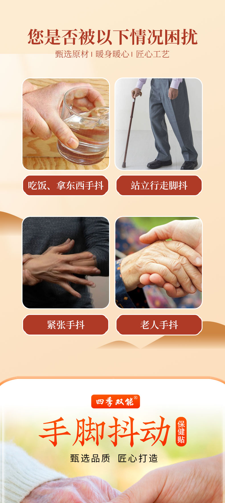 四季雙能手腳抖動保健貼,甄選草本原材萃取,溫和呵護(hù),科學(xué)配比,親膚舒適,適宜于腳抖手抖的亞健康人群,配方、使用方法、持續(xù)溫護(hù),正規(guī)廠家,標(biāo)準(zhǔn)化生產(chǎn)車間,多樣化貼劑定制,出貨快,承接貼牌代加工,支持批發(fā)代理,量大從優(yōu)。