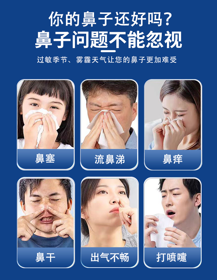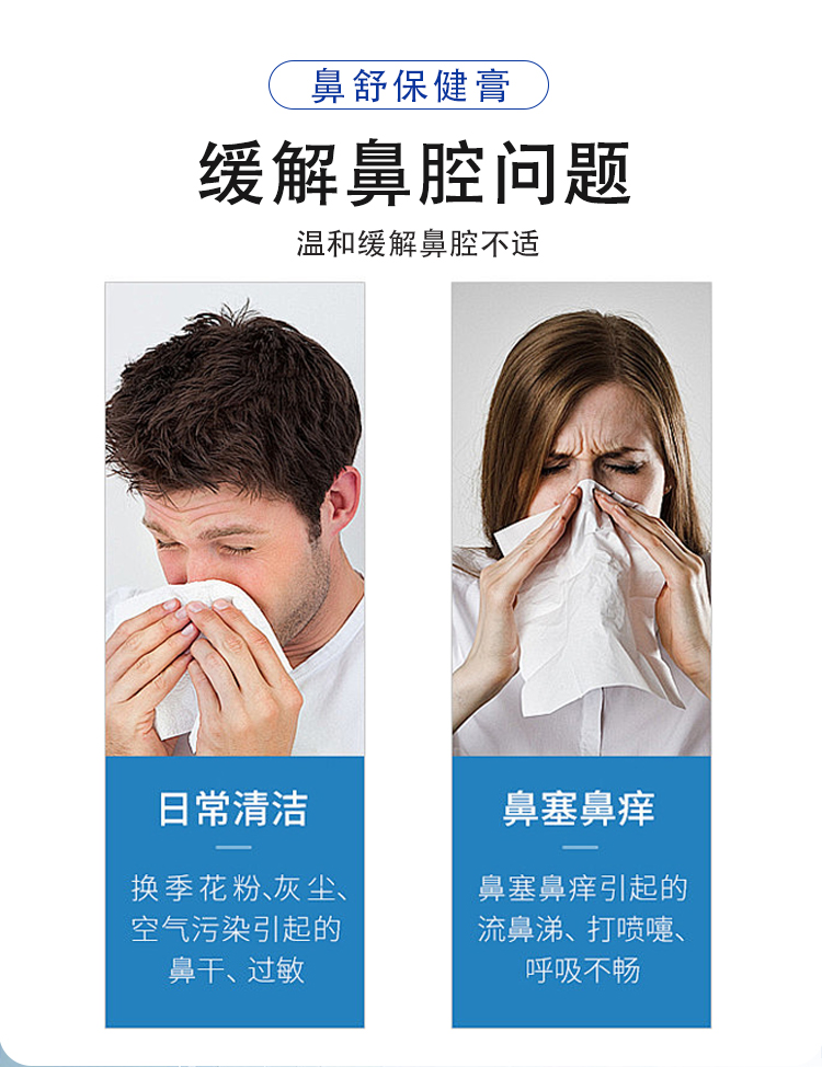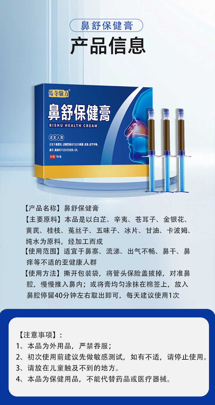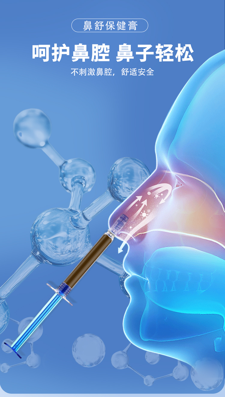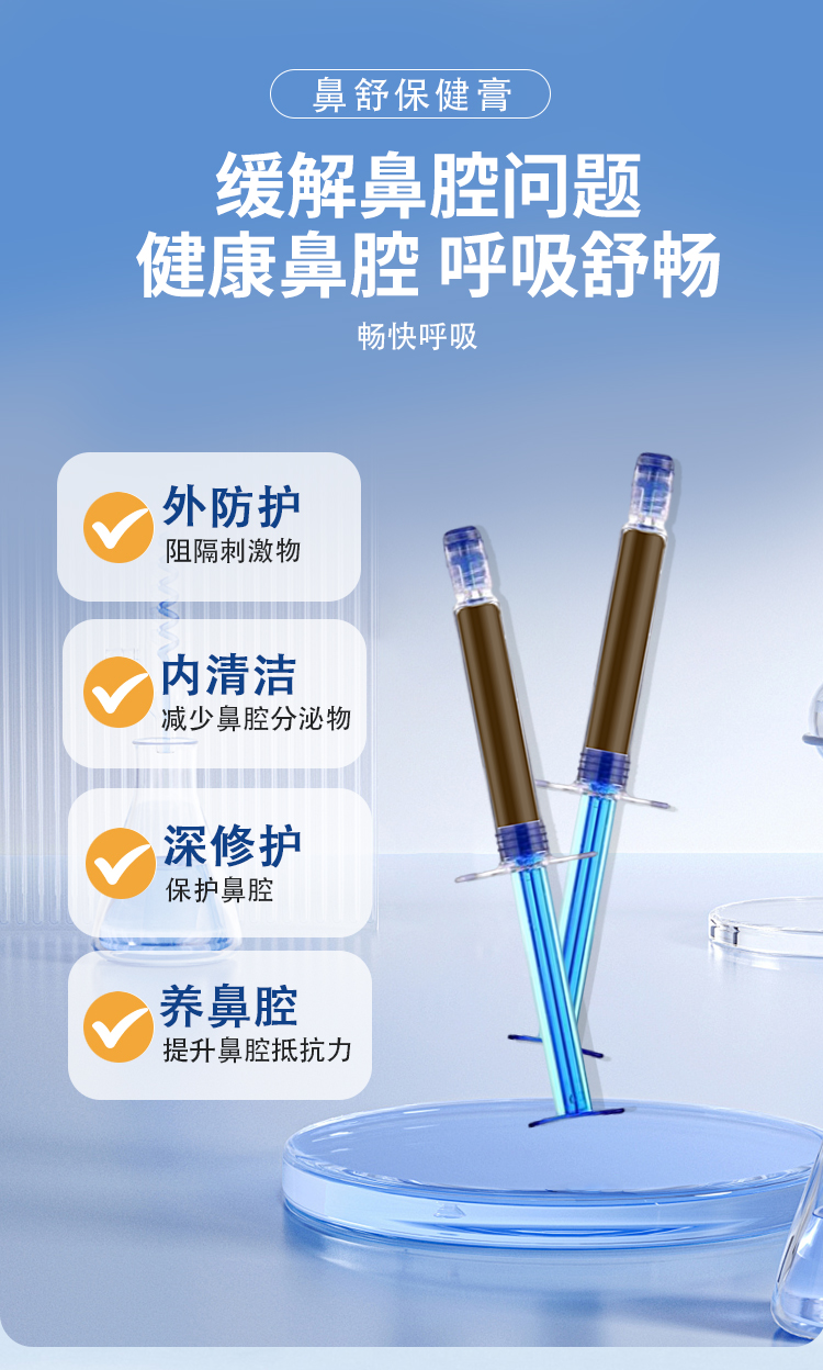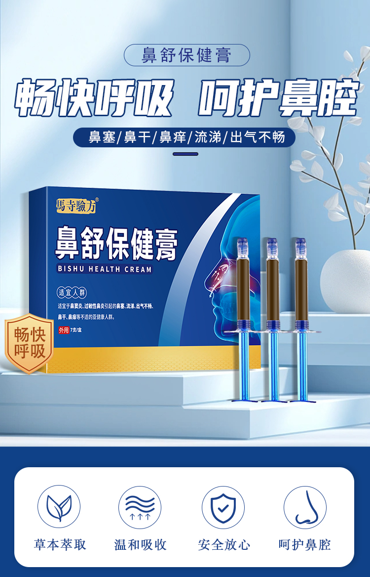 鼻舒保健膏,以草本成分為主的鼻腔護理產(chǎn)品,適用于鼻塞、鼻干、鼻癢、流涕、出氣不暢等鼻部不適,規(guī)格為7支/盒,將管頭保險蓋拔掉,對準(zhǔn)鼻腔,慢慢推入鼻內(nèi),每天建議使用1次,源頭廠家,多樣化oem貼牌代加工。