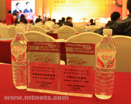 2009年4月17日-18日,“中小企業(yè)電子商務應用發(fā)展大會暨2008第四屆中國行業(yè)電子商務網(wǎng)站TOP100評選頒獎盛典”在“行業(yè)網(wǎng)站總部基地”——浙江寧波隆重舉行。17日下午,激動人心的電子商務網(wǎng)站TOP100評選頒獎更是掀起此次千人盛典的高潮,明通旗下兩大實力網(wǎng)站,中國化工儀器網(wǎng)www.chem17.com和中國食品機械設備網(wǎng)www.foodjx.com均獲得“中國行業(yè)電子商務網(wǎng)站TOP100”榮譽。