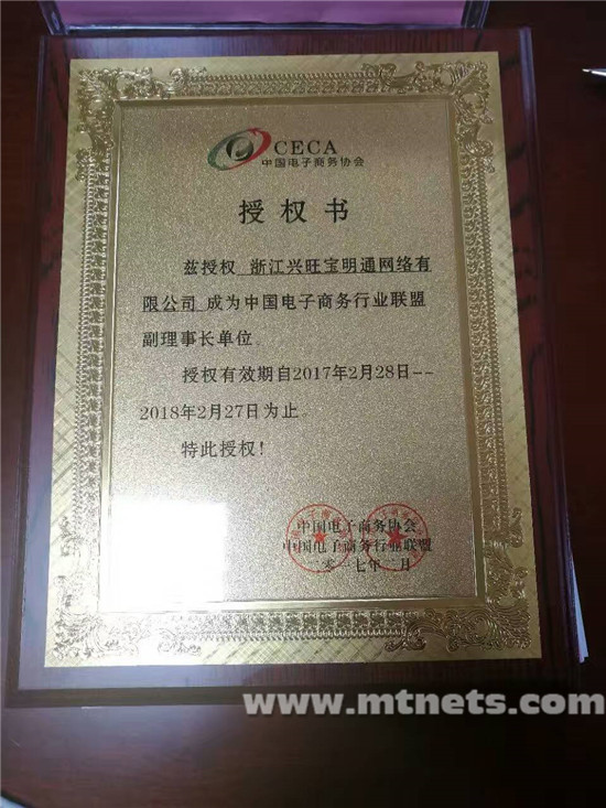 2017年2月28日,中國電子商務(wù)行業(yè)聯(lián)盟會議在京舉行,國家文化部原副部長潘震宙、中宣部辦公廳原主任薛啟亮、國家工信部政策產(chǎn)業(yè)司巡視員辛仁周等領(lǐng)導(dǎo)出席本次活動。在第一屆中國電子商務(wù)行業(yè)聯(lián)盟理事會上,中國電子商務(wù)協(xié)會授權(quán)浙江興旺寶明通網(wǎng)絡(luò)有限公司成為中國電子商務(wù)行業(yè)聯(lián)盟副理事長單位。