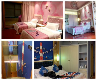 午飯之后,小伙伴們都回到房間休息一下。這家酒店的主題風格獨特(室外參考上文),以庭院雅居、別墅為主。而我們選擇了粉色和藍色兩種主題,粉色瞬間激起人的“少女心”,感覺自己萌萌噠!