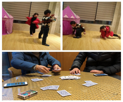 午休時間,寶貝們和大人們分成兩派,各自開啟娛樂耍玩。這不,哥哥教妹妹在房間榻榻米上練武,打拳,那妹妹呢?難道是看了十分火熱的《這就是街舞》節(jié)目之后,想要教哥哥breaking(地板舞),哈哈!而大人們“摒棄”低頭玩手機,集體打起了牌。一邊是孩童們自成一體“表演”,另一邊是大人們嗨起的“牌場”,好不熱鬧......