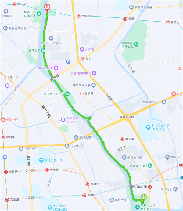 本次活動(dòng)的線路是沿著運(yùn)河游步道,從西湖文化廣場(chǎng)走到運(yùn)河文化廣場(chǎng)拱宸橋下,全長(zhǎng)約5.5公里,全程用時(shí)約1小時(shí)20分鐘。